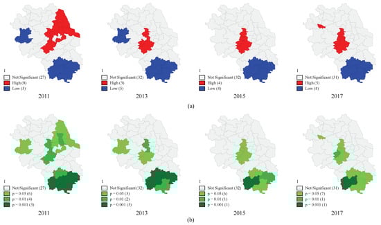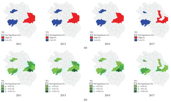 LISA maps for SO emissions in Yangtze River Delta. (a) cluster maps, (b) significant maps.