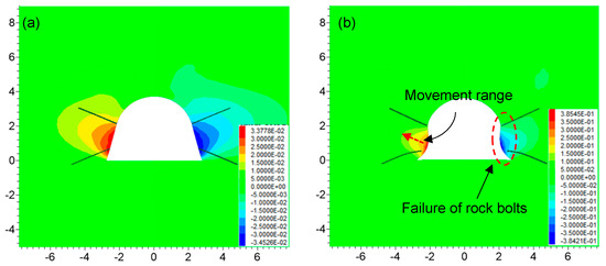 The horizontal roadway displacement with time is depicted in Figure 7. After roadway excavation (Figure 7a), the horizontal deformation was small and it was mainly caused by the instantaneous failure deformation of coal mass at the roadway surface. With the increase of time, the deformation sidewalls increased gradually, which was mainly composed of the rheological deformation and plastic-flow deformation of the coal mass (Figure 7b–f). Moreover, the deformation behavior of the roadway exhibited not only the increases of the displacement on the roadway surface but also the increase of movement range in coal mass (as indicated by the red dashed arrow). It can be clearly seen from Figure 7b that after 15 days, the rock bolts lost the use of reinforcement and completely failed due to the large sidewall extrusion of the roadway (shown by a red dashed circle). Thus, the roadway convergence was more serious over time.