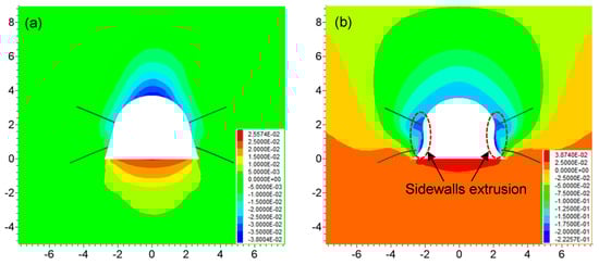 The vertical displacement of the roadway with time is illustrated in Figure 9. Similar to the deformation in sidewalls, the roof deformation increased with time, and the movement range of coal mass around the roof also increased gradually (Figure 9a–f). As for the deformation on the roadway floor, the values were basically unchanging after roadway excavation. This is because the lithology in the floor is mudstone with relatively high strength and its failure can be regarded as plastic damage, while the immediate roadway roof is soft coal mass with serious rheological property and consequently the roof would be in rheology for a long time. Another phenomenon that should be pointed out is that the extrusion part in sidewalls (shown by the red dashed circle in Figure 9b) also demonstrated vertical displacements. The horizontal and vertical displacement in extrusion sidewalls formed a combined displacement with downward and inward movement to the roadway, which can accelerate the deformation of sidewalls. This is extremely adverse to the stability of the roadway and needs to be expanded and eliminated in time.