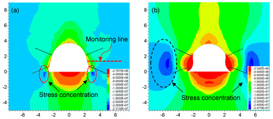 Around the roadway, the development of maximum principal stress with time is depicted in Figure 11. It is clear that there was a large stress relief zone around the roadway after excavation. Compared with the in-situ stress (about 19 MPa), the stress value near the roadway surface was far lower (Figure 11a–f). Due to the absence of support on the roadway floor, the stress relief area of the floor was large and it was almost unchanging with the increase of time. This is mainly because the floor had been completely damaged just after excavation and therefore the stress release of strata was complete. At the same time, it is noted that there were two stress concentration areas near the bottom corners of the roadway (as shown in the red dotted circle in Figure 11a), which was caused by the rigid support system on the roadway for undertaking and transferring the high stresses. However, with the increase of time and sidewall deformation, the size of these areas decreased and even disappeared. Generally, the stress relief zones of the roof and two sidewalls gradually increased (Figure 11a–f). Two stress concentration zones with high-stress values formed (as shown in the black dotted circle in Figure 11b) in the deep sidewalls of the roadway, and their range and size gradually changed with the increase of time (Figure 11c–f).