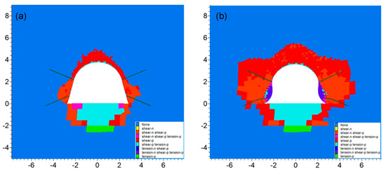 From Figure 13, it can be seen that there were some shear failures in the roof and two sidewalls of the roadway (Figure 13a). At the same time, and the roof also had a small number of tensile failures, while the majority failures of the floor were tensile damage. At 15 days, the extent of the plastic zone in sidewalls had completely exceeded the length of rock bolts, indicating the bolting support system has finally lost its function (Figure 13b). About 60 days later, the plastic zone of the roof and the two sides of the roadway tended to be stable (Figure 13c). With the increase of time, though the change of the plastic zone was not very obvious (Figure 13d–f), some areas around the roadway had a tendency to be in the plastic state, which was mainly affected by the long-term rheological behavior of coal mass. The development of maximum failure depth of the plastic zone is given in Table 5. In general, the characteristic of the maximum depth of plastic zone around roadway was “sidewalls > floor > roof” and the property of the development speed of the plastic zone was “sidewalls > roof > floor”.