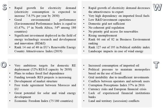 The core objective of this paper is to assess, through case studies and integrated analysis to what extent cooperation with developing neighboring countries can help Europe achieve its RES targets and beyond this, trigger the deployment of RES-E projects in the host countries and create synergies and mutually beneficial circumstances for all involved parties [7]. In order to support the development of cooperation mechanisms and implement a successful collaboration, the current and future situation of the host country need to be examined, so as to be able to develop the most appropriate energy policies [8]. This could be achieved through the analysis of Strengths, Weaknesses, Opportunities and Threats (SWOT) of the country under examination.