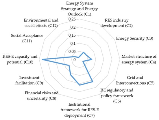 Within this three-level structure, 12 pivotal factors (criteria) were identified reflecting the favorable and non-favorable conditions for joint RES projects, between EU and neighboring countries (Figure 4). The energy profile criteria are: energy system strategy and energy outlook (C1), RES industry development (C2) and energy security (C3). The investment profile criteria are: market structure of energy system (C4), grid and Interconnections (C5), RE regulatory and policy framework (C6), institutional framework for RES-E deployment (C7), financial risks and uncertainty (C8), investment facilitation (C9) and RES-E capacity and potential (C10) The socio-environmental criteria are: public acceptance (C11) and, finally, environmental and social effects (C12). These assessment criteria were presented to experts and stakeholders in order to gather feedback and proceed with the SWOT analysis based on the responses received.