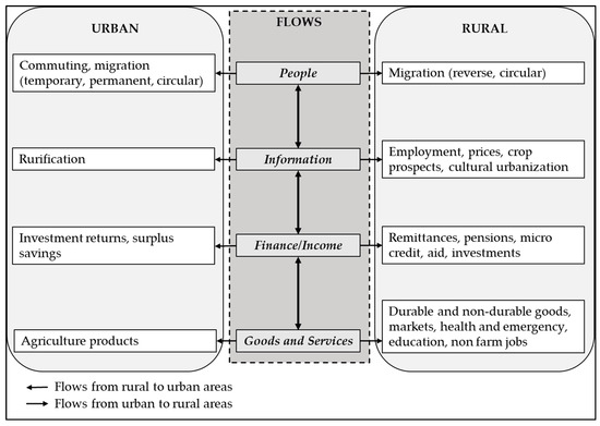 - Rural–urban linkages discourse considers rural areas, not as isolated entities but also characterized by their relationship with their nearest urban areas. This relationship is represented by the flow of people, information, finances, goods, and services, which bind both areas and helps in development, particularly of rural households and communities.