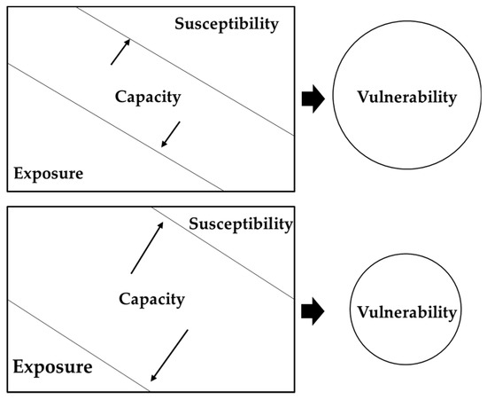 Susceptibility is one of the central components that explains the degree of vulnerability of exposed elements. Susceptibility—also termed as sensitivity or fragility—is defined, as the degree to which a system is modified or affected by hazard or climate variability [66,76]. It is a predisposition of an element at risk to suffer harm [4]. Susceptibility describes the characteristics and condition of a system which differentiates the magnitude of impacts for a given exposure [27,31,75]. These characteristics and conditions mainly refer to social, economic, physical, institutional, and environmental setting of a system [65]. It mainly corresponds to negative characteristics i.e., deficiencies and problematic conditions of a system [73] (see Figure 2). However, a community or system significantly exposed and susceptible to hazard, does not have to be highly vulnerable since capacity influence vulnerability (see Figure 3).