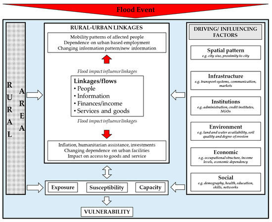 Rural communities, linkages, and factors are under the umbrella of the flood event in order to display rural area as prone to flooding. As shown in Figure 5, rural–urban linkages and components of vulnerability (exposure, susceptibility, and capacity) are influenced by multiple factors. These factors shape the internal characteristics of rural communities and direct behavior and intensity of linkages as presented in Section 3.2. The flow of people, information, finances, goods and services also customize exposure, susceptibility, and capacity of rural households. In the case of a flood event, cities provide information, multiple services, goods, and finances to rural areas; for example, flood warning, evacuation and relief services, non-food items etc. (see Section 3.1). These flows can alter exposure, susceptibility, and capacity of rural households.