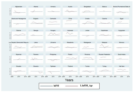Figure 3 gives the impression that the relationship between the two variables is unclear. While food security continues to increase, agricultural FDI is unsteady. By applying some simple calculations, based on the same data that was used in Figure 3, we found that the changes in lnFSI to the changes in FDI_Agr on average are positive, with a value of about 0.01318, which refers to a positive relationship between these two variables. From Figure 3, we notice a sharp decline in the average agricultural FDI for the sampled countries in 2008 and 2011, followed by a new rise (where we use the lag values of FDI_Agr). If we return to the circumstances surrounding these two periods, we will find that the global financial crisis was in 2008, and in 2011 stock markets faced a sharp fall for about half a year in different countries. The situation in 2011 cannot be described as a real financial crisis, but it seems that the investors were very cautious, fearing reaching the same conditions as the financial crisis of 2008, This behavior can be explained in that the financial crisis and economic recession led to an increase in the uncertain conditions, access to credit from the banking and financial sectors became more restrictive, and, consequently, investors took a more cautious approach and the FDI in the agriculture sector decreased [39,40].