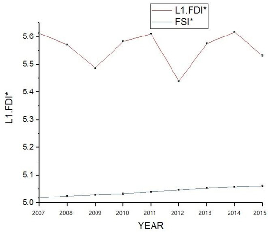 The relationship between FSI and FDI_Agr. L1.FDI*= first lagged of average (ln (FDI_Agr)) /3; FSI*= average (ln (FSI)).