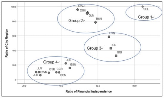 Ratio of city region and financial independence in 16 metro regions in the Republic of Korea.
