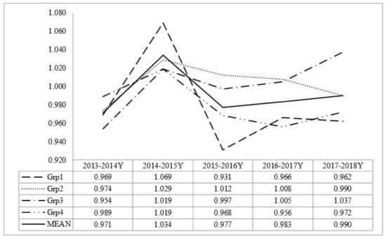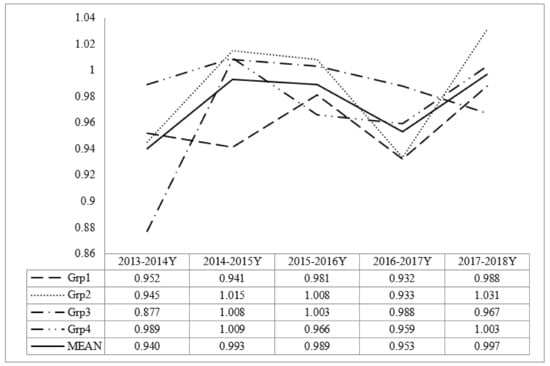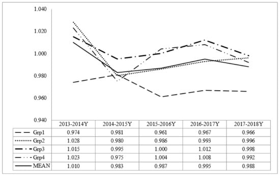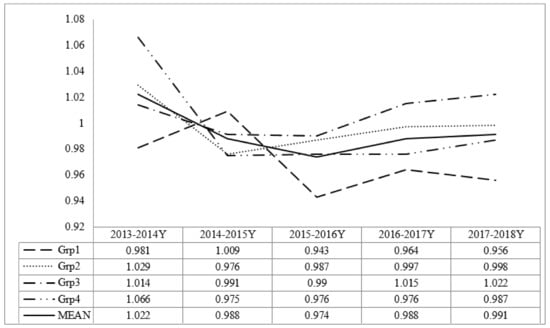 Last, as shown in Figure 4, the MPI was calculated for other industry not related to the tourism- and culture-related industry based on other VA (OVA) as the output, and other budget (OB = TB − CTB), other business establishments (OBE), and other employments (OE) as the inputs. This value was used as a benchmark to understand the efficiency and productivity of tourism and culture-related industry. Unlike tourism- and culture-related industry, the MPI values across years seem stable with a slight downward trend after 2013–2014. Note, three groups (Grp2, Grp3, and Grp4) showed a value higher than 1 in 2013–2014, whereas only Grp3 maintained a value higher than 1 in 2017–2018. This result indicates that the MPI decreased for all regions except for the industrialized/urbanized regions.