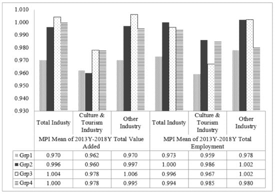 We additionally analyzed the effect of financial investment on tourism- and culture-related industry in different regions by comparing added value and employment creation among the four DMUs. Specifically, the value-added MPI of industrialized cities (Grp3) and less developed areas (Grp4) was higher than that of Grp1 and Grp2. The employment MPI was higher in traditional cities (Grp2) and less developed areas (Grp4) than for Grp1 and Grp3. In general, Grp4 had a value of lower than one; however, this value proved to be relatively higher than the other three groups, thereby indicating potentially high return on investment for financial investment in the region.