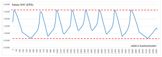 The numerical result was derived as shown in Table 2. The optimal battery capacity was set as 3.2389 kWh while the overall electricity consumption at one round trip of total route described in Figure 5 considering the provided electricity by regenerative braking is 12.5041 kWh. Supposing that a decision maker introduces a pure battery-powered electric tram system instead of a wireless charging electric tram, it is also necessary to calculate the required battery capacity. It can be calculated assuming no wireless charging infrastructure can be installed on all railways; the required battery capacity is then 21.9392 kWh. In other words, the required battery capacity can be reduced to 14.76% by introducing a wireless charging electric tram. Of course, the additional cost of wireless charging infrastructure is required, but the utility of the wireless charging electric tram system can be confirmed considering the fact that the battery itself is an important environmental pollutant.