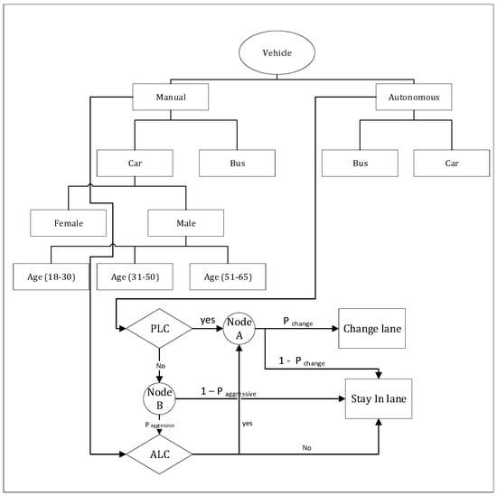 Figure 2 represents the lane-changing behavior pattern of a simple case in which a standard manual car is willing to change lane. It will check the conditions of ALC and, if they are met, it will change lane on the basis of an acceptable probability. Figure 3 presents the complete schematic diagram of the proposed model. SF, in Figure 2, stands for minimum front safety distance.