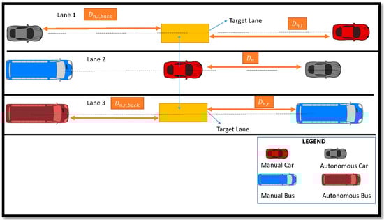 The lane change behavior of different drivers that occurs on an urban road is diverse. The lane-changing decision process is modeled as a series of three steps: choosing a lane change, choosing a goal lane, and acknowledging gaps. To capture lane change behavior, we have implemented two types of lane change policies. The first one is the aggressive lane change and the second one is the polite lane change policy for the autonomous and manual vehicle, to simulate real-time traffic maneuvers with different vehicles, which are the basis of this study. We also added a probability factor for the lane-change transition, as in some situations, even if the situation is in their favor, vehicles may not choose to switch lanes. Besides, the front length of vehicles in the target lane should be greater than the minimum safe range (headway) for the lane change. Changing the lane in any direction is appropriate. The first preference is given in the template to switching to the left lane. If the situation is not suitable, however, it is appropriate to change to the right lane rules. If the vehicles are unable to change lane in either direction, they must shift their speed and remain in the same lane. There is another restriction on buses so, that both autonomous buses (ABs) and manual buses (MBs) can travel only on the first and second lanes, and cars can use any lanes to simulate real-world traffic maneuvers. There are different nomenclatures for both the right lane change and the left shift laws.
