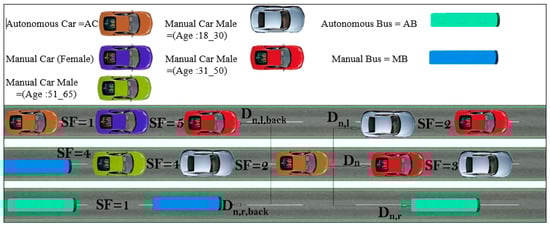 Due to their lower reaction delay, the minimum safe distance is specified as 1 cell for each autonomous vehicle, while the minimum safe distance for the manual car (age: 18–30), (age: 31–50), and (age: 51–65) is 2, 3, and 4 cells, respectively. On the other hand, the minimum safe distance is 5 cells for the manual vehicle, which is driven by a female. The manual bus has a safe distance of 4 cells. According to AASHTO (American Association of State Highway Officials) [66], the perception reaction time is 2.5 s. Based on this information, we have different sets of the reaction time period, which for the male driver (age: 18–30), (age: 31–50), and (age: 51–65) is 2,3, and 4, respectively, and for the female driver 4 s. Table 2 shows the attributes of different types of vehicles simulated in the model.