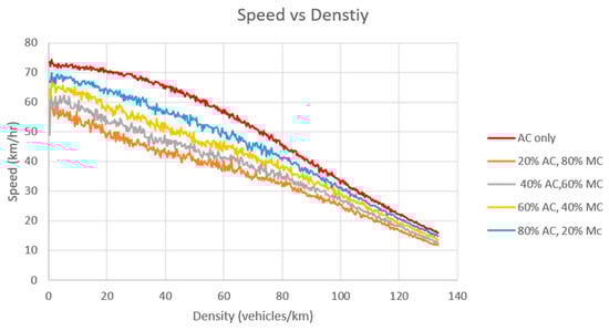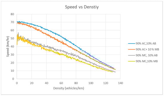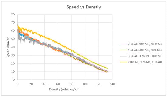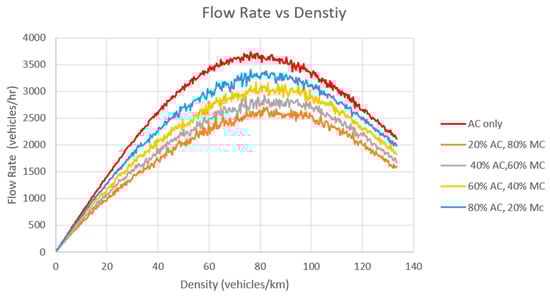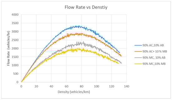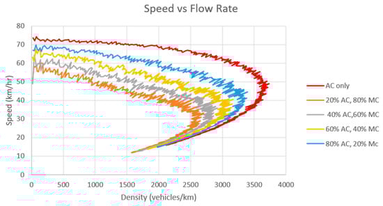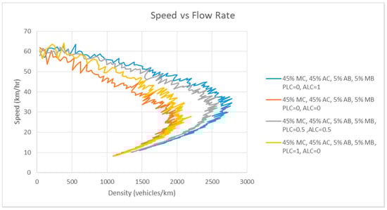 Figure 4 presents the speed–density relationship of Scenario 1. Figure 5 documents the speed–flow rate relationship of Scenario 1, and Figure 6 denotes the flow rate–density relationship. There are five types of simulation in this scenario. The goal of this arrangement is to assess the performance of the model in which AC runs parallel with MC (different genders and age groups).