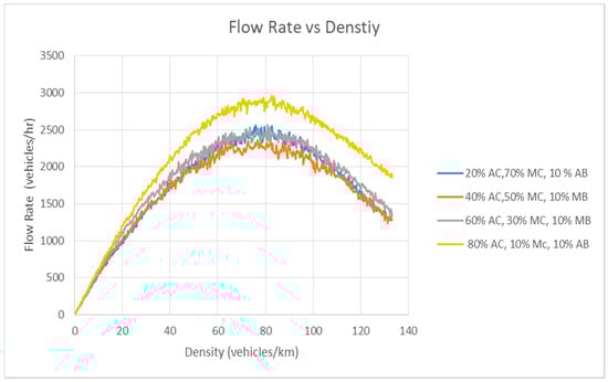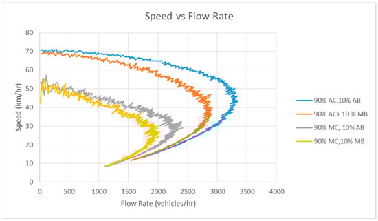 Figure 7 presents the speed–density relationship of Scenario 2. Figure 8 documents the speed–flow rate relationship of Scenario 2, and Figure 9 denotes the flow rate–density relationship.
