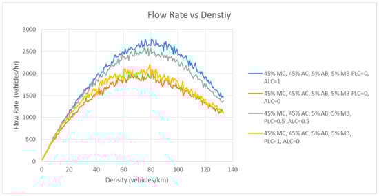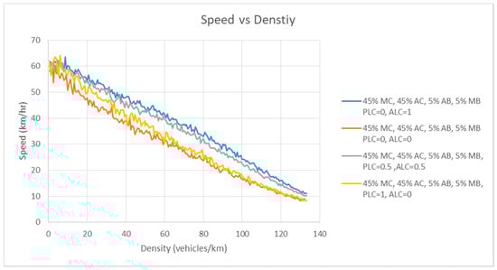 Multiple scenarios with different compositions have been simulated for the purposes of the current research. The comparisons made in each scenario are based upon traffic fundamentals diagrams, i.e., speed, density and flow rate. In Scenarios 1 to 3, different compositions of autonomous cars (ACs), manual cars (MCs), ABs, and MBs have been adopted to understand the impact of heterogeneous traffic flow on the overall capacity of the network in the presence of different autonomous vehicles and different manual vehicles. As mentioned before, the manual cars have been further categorized into male and female drivers, and male drivers were further subcategorized based on age groups. In all of these scenarios, the value of PLC and ALC was kept constant at 0.5 to highlight the influence of different gender and age group cars on the overall transportation system in the presence of autonomous vehicles, and to determine whether autonomous vehicles can positively change the network’s capacity. In Scenario 4, the percentage of vehicles was kept constant, with variable values of ALC and PLC. The objective of Scenario 5 is to understand the paramount importance of different lane-changing behaviors in mixed traffic flows. It was emphasized here that in the adopted model the autonomous vehicles can follow both PLC and ALC behaviors, whereas manual vehicles will only follow ALC, irrespective of gender and age. Table 3 lists the detailed compositions of all simulated scenarios in this study.