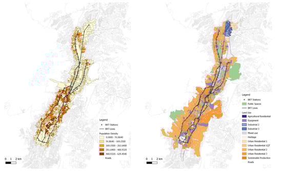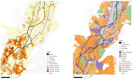 BRT network in Quito: (left) BRT and population density; (right) BRT and land uses.