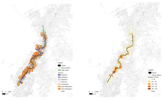 Subway line in Quito: (left) subway and population density; (right) subway and land uses.