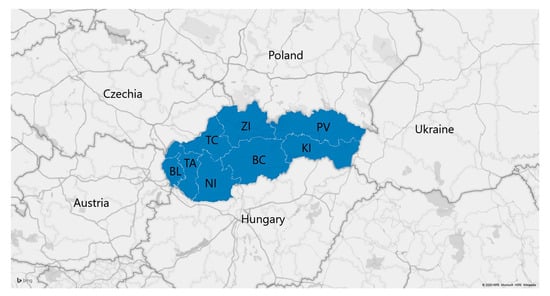 For each of the monitored indicators, we calculated the average values clearly by using the chopped average method, where the selected percentages of the lowest and highest values are not included in the average calculation. In the submitted work, we operated with the values of the eight regions of Slovakia mentioned in Figure 1 [35,36]. After computation of the three indexes, we constructed the overall index, the Quality of Life Index, as an average of Indexes I., II. and III. As all three indexes are very important, we did not use weights. Researchers highlight that finding the right ratio between social, economic and environmental factors is hard to find [10]. This process will need deeper research and, maybe, a questionnaire on the perception of the importance of these indicators by the citizens of Slovakia. This is beyond the aim of the presented study.
