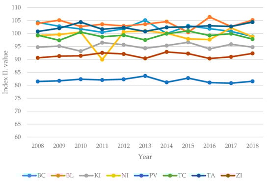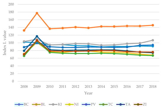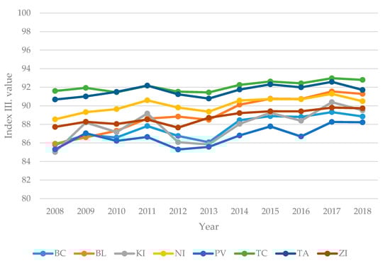 The next index is constructed mainly of the social characteristics of the selected regions. Values were analyzed for the entire period 2008–2018 and are shown in Figure 3.