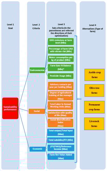 Despite the large amount of data needed, the concurrent consideration of all pillars of sustainability through AHP at the farm level, based on an enriched database of FADN, can provide a meaningful set of indicators that enable a thorough sustainability assessment. By applying the proposed methodology, we have identified significant intra- and inter-agricultural system heterogeneity in regard to the sustainability performance of different farms, as well as a clear ranking of the relative performance of the examined systems. At least two of the studied farming systems were found to be both extensive and sustainable in economic, social, and environmental terms. In addition, three “typical” Mediterranean farming systems, as practiced by professional farms in Greece (permanent crops, olive trees, and sheep), were observed to be more sustainable than arable crops.