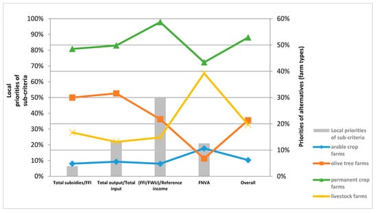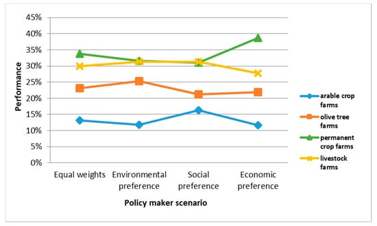 As we have seen, the relative ranking of the examined farming systems seems to be consistent across four different policy priorities. This finding implies that even under diverse prioritization concerning the three pillars of sustainability, permanent crops, olive trees, and sheep will be expected to outperform arable crops. Hence, the proposed varied prioritization of the three pillars can aid policymakers to have a clear picture of the expected sustainability performance of each farming system.
