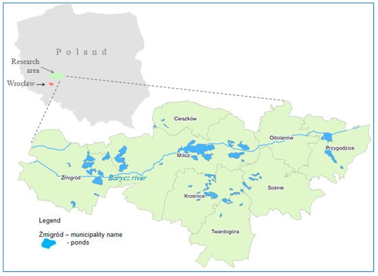 The Barycz Valley is located in the north-eastern part of the Lower Silesian Province and in the south-western part of the Greater Poland Province. It includes eight communes: Cieszków, Krośnice, Milicz, Twardogóra, and Żmigród in the territory of the Lower Silesian Province and Przygodzice, Odolanów, and Sośna in the territory of the Greater Poland Province, as shown in Figure 1.