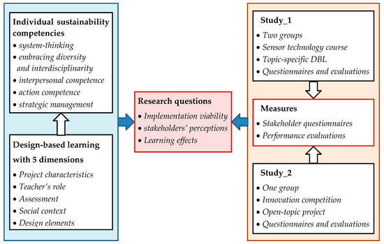 Considering the benefits of design-based learning (DBL) and the lack of relevant research, the purpose of this study is to explore a teaching approach for the integration of DBL activities in engineering educational programs. Specifically, we present the three research questions outlined in Section 1. To answer these questions, we implemented two separate studies with engineering undergraduates in typical educational activities, which are a sensor technology course and an open-topic innovation project. Stakeholder questionnaires and performance evaluations are used to measure the DBL approach. The research sketch is shown in Figure 1.