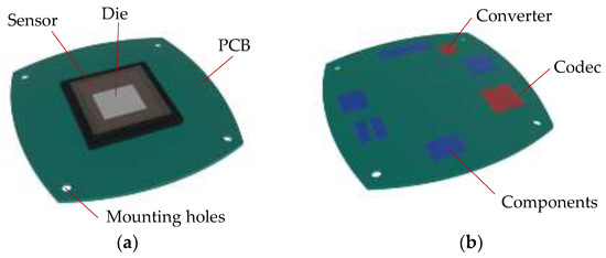 The image sensing module with an ultra-low-noise image sensor. (a) Top surface of the module; (b) bottom surface of the module.