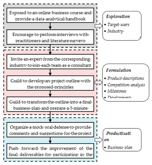 The DBL activity ran a full semester with eighteen weeks. The teaching procedure adopted a framework similar to that of Study_1. The flowchart and outcomes are shown in Figure 4. Differently from the topic-specific task in Study_1, the participating teams needed to choose their entrepreneurial projects. Considering that the participants in Study_2 were engineering undergraduates, they first were exposed to an online business course describing entrepreneurial strategy and sustainability as well as change management. The first and most crucial step in entrepreneurship is to clarify the market boundary through data analysis, that is, the opportunities and challenges of the industry. The primary reading material was a practical handbook [41], which addresses how to achieve business value from data analysis. The students were required to collect the primary data from interviews with practitioners and literature surveys. The outcomes included unmet user core demands and corresponding target market capacity. QQ group was used as an online communication tool where the discussion was carried out and all material was submitted.