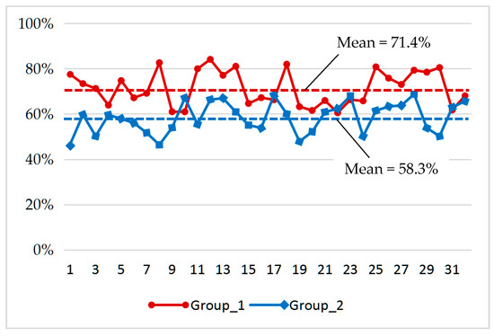 In Questionnaire_2, 32 respondents provided valid responses (response rate: 91.4%). More than half of the respondents (20/32) reported having no experience in learning sustainability competency. Almost all respondents (31/32) stated that they had plans to attend a course related to sustainability competency. Figure 5 shows the ratio of answering “yes” to Question (6) for each respondent based on the design reports from Group_1 and Group_2. The ratio means are 71.4%. Thus, the results show the practitioners favored working together with the students in Study_1.