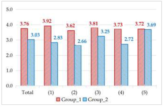 Figure 6 details the mean of students’ scores for Group_1 and Group_2 in Study_1. We verified these mean values by statistical hypothesis testing at the significance level of [43]. The results showed that the mean total score (3.76) of Group_1 was significantly higher than that (3.03) of Group_2 . By comparing the mean scores of the two groups in the five evaluation terms, we found that Group_1 had significant advantages in terms of (1) problem statement, (2) performance measurement, (3) normative modeling, and (4) graphic representation. A significant difference was not found in (5) design validation .