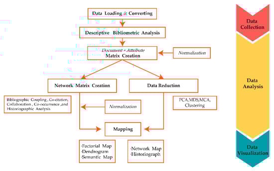Developed in 2017 by Professor Massimo Aria, the Bibliometrix software package is a new R-based bibliometric software package [23]. It can import and process literature information from Scopus and Web of Science databases and statistical analysis of the relevant scientific literature index, the construction of the co-occurrence matrix, co-citation, coupling, cooperative analysis and co-word analysis, subject evolution analysis and other aspects of research and visualization can be performed. Thus, the Bibliometrix software package can independently complete the five-step bibliometric statistical analysis process of study design, data collection, data analysis, data visualization and interpretation (see Figure 1). However, only a small number of scholars have used Bibliometrix for bibliometrics and visualization [24,25]. Based on the outstanding advantages of this analytical tool, this paper attempted to apply it to the research field of land ecosystem services and conduct a comprehensive bibliometric analysis of the global research results of land ecosystem services. This can be used as a reference for other bibliometric researchers.