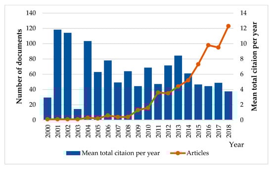The number of documents issued in China is the highest in the world, with a volume of 187 articles. However, the average citations per item in China is only 14.56, which is still a certain gap compared with the citations of other countries. This shows that the overall quality level of China’s land ecosystem services literature is not high. Land ecosystem services research of China mainly focuses on the evaluation system and evaluation methods, the value dynamic evaluation model research [31] and the ecosystem service marketization mechanism research. Li [32] used LANDSAT TM image to study the changes in land use and ecosystem service value in the main urban area of Jinan from 1998 to 2002. The results of the study show that forest land and farmland provide 80% of the total value of ecosystem services. However, with the acceleration of the urbanization process, the area of cultivated land has gradually decreased and the area of construction land has increased rapidly. As a result, between 1998 and 2002, the total value of ecosystems fell by 42.86 million yuan, with an average annual decline of 3.06 million yuan.