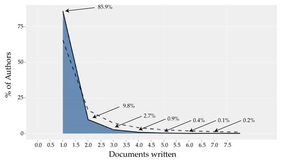 The study of the laws of the authors of the literature began with Lotka in the 1920s. Lotka’s law is an important law that studies the relationship between the number of documents published by authors in a subject area and the authors who publish them. It believes that the relationship between the number of authors and the number of documents can be expressed as , where is the number of documents, and is the ratio of the number of authors who have published x articles to the total number of authors; is the Lotka constant, which refers to the proportion of authors who have published only one document to all authors. is the Lotka index, which is usually 2. Lotka’s law can more clearly distinguish between high-yield authors and low-yield authors in the field of land ecosystem services, which can further describe the distribution of scientific productivity in this field.