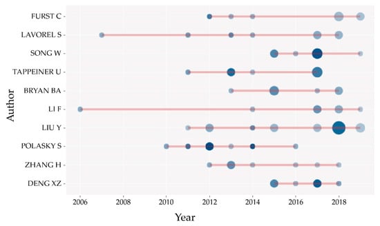Figure 4 (the shade of the color indicates the citation of the author, and the size of the circle indicates the amount of paper published. The specific values are shown in Appendix A) and Table 3 list the top 10 high-yield authors in the field of land ecosystem services. The author with the largest number of papers published and the highest number of citations is Frust C. Furst has published papers in the field of land ecosystem services since 2012. His main research direction is to evaluate the value of ecosystem services. Frust C’s paper ‘Assessment of the Effects of Forest Land Use Strategies on the Provision of Ecosystem Services at Regional Scale’, published in Journal of Environmental Management in 2012, was cited 18 times [29]. Fürst [29] believes that combining spatial explicit analysis based on land use scenarios with more detailed classifications of land use and assessing land use patterns can provide a good basis for forest management planners and regional planners to develop strategies. In view of this, Frust used spatial explicit methods to measure the impact of unstructured agriculture and short rotation coppice on ecosystem services. The results of the study indicate that the use of short rotation coppice instead of afforestation areas will reduce the total amount of biological resources and cause economic losses.