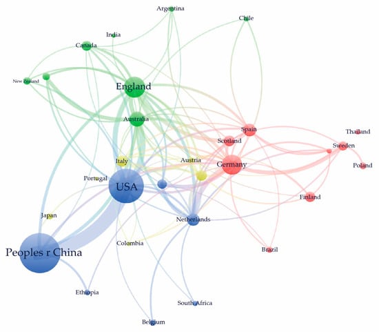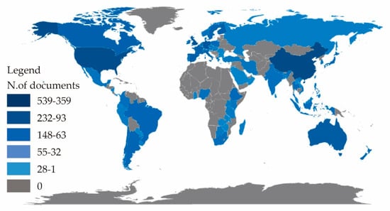 The relevant information of the top 20 countries with the number of published documents is shown in Table 4. It can be seen from Table 4 that: (1) the research strength of developed countries is significantly stronger than that of developing countries. Among the top 20 countries, only China, Argentina, Brazil and Thailand are developing countries. (2) The number of European and American countries is significantly higher than that of Asia, Africa and Oceania (as shown in Figure 5). The United States is far ahead of the world in terms of its number of publications, and its publications account for about 14.6% of the sample. (3) On the whole, the influence of countries with a small amount of publications is not necessarily weak, such as Finland and the Netherlands. Their total citation frequency is significantly higher than countries with more publications.