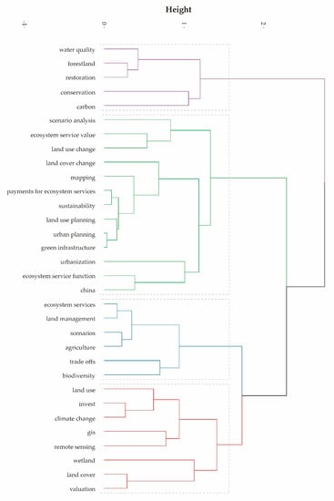 Tree dendrogram of hierarchical cluster analysis of keywords in the field of land ecosystem services.
