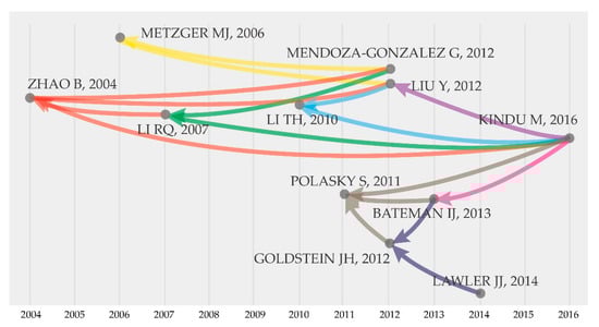 The historical citation analysis can graphically display the relationship between different documents in the field of land ecosystem services, and can quickly help scholars to draw a history of development in the field, and to locate important documents and the latest important documents in the field.