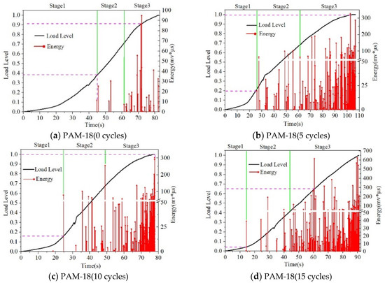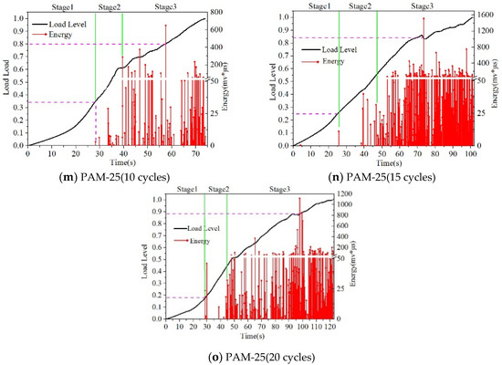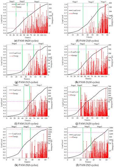 - Acoustic emission parameters well reflect the stress characteristics of the specimens during the low-temperature splitting process. Under the effect of F-T cycles, the damage stage and destruction stage of the three groups of PAMs were advanced. The larger the proportion of coarse aggregate in the PAM, the greater the single energy released by the specimen during the destruction process.