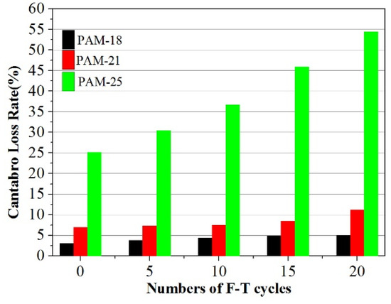 - The air void is the main factor that affects the cohesiveness between aggregate and asphalt. The larger the air void, the larger the Cantabro particle loss of the specimen, and the greater the adverse effect of the freeze-thaw cycle on the adhesion of the aggregate to the asphalt. When the air void reached 25%, the Cantabro particle loss rate of the specimen was far greater than the 15% in the specifications, regardless of whether it suffered the F-T cycles or not.