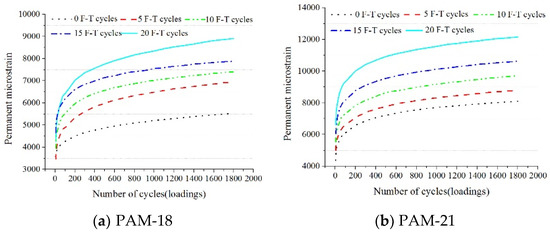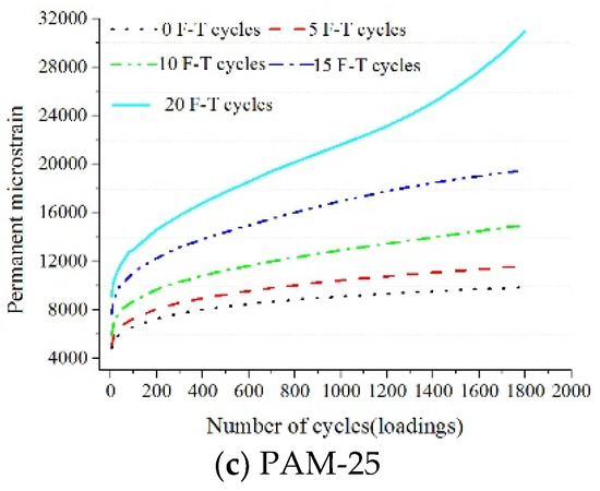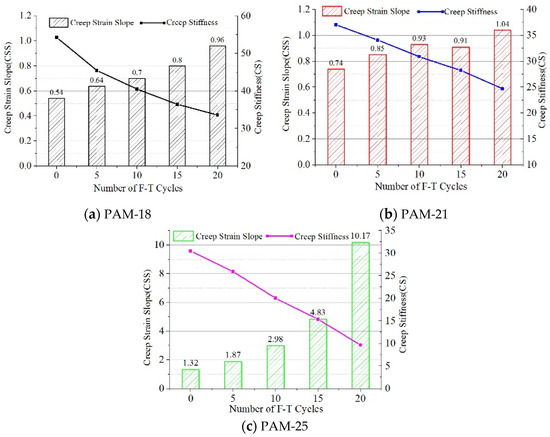 - Both the air void and F-T cycles are important factors affecting the high-temperature viscoelastic properties of PAM. As the air void and the number of F-T cycles increased, the creep strain slope of the three groups of PAMs gradually increased and the creep stiffness gradually decreased. When the air void is greater than 21%, the adverse effects of F-T cycles become apparent.