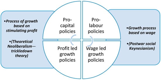 One important step in using this strategy is a clear distinction between the distributional policies and the economic regimes. Engelbart Stockhammer [12,13] underlines the differences between the pro-labor and pro-capital distributional policies and the wage-led and profit-led demand and supply regimes. He shows that the pro-labor policies are shifting the income distribution in favor of labor, while the pro-capital policies are also distributional policies, but they shift the income distribution against labor.