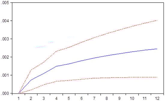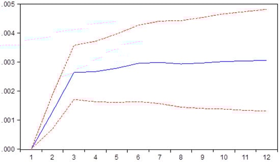 Due to the interdependencies between the variables selected, the impact between them being mutual, we have decided to use a VAR model, one the most versatile research methodologies available in our research inventory. The robustness tests were performed for VAR stability (Table A4), VAR order selection (Table A5), VAR residual portmanteau tests for autocorrelations (Table A6), VAR residual serial correlation LM tests (Table A7), and VAR residual heteroskedasticity tests (Table A8). Thus, by the test performed, the robustness of the VAR model has been proven, and therefore we can continue to the impulse response functions. The composition tables are presented in the Appendix A as Table A1, Table A2 and Table A3.