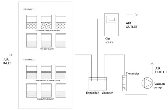 The dynamic chamber technique [22] was used to measure the gaseous fluxes from each vessel once a day for five days per week. During the monitoring period, the vessels filled with manure were placed open in the climate room. When measurement started, they were closed with a lid with two holes: one for the inlet of the air and the other connected by means of a Teflon tube to the expansion chamber. This was then connected to a sensor. Air exchange was provided through a vacuum pump and a flow meter which regulated the air exchange to 1.5 l min−1 (Figure 1).