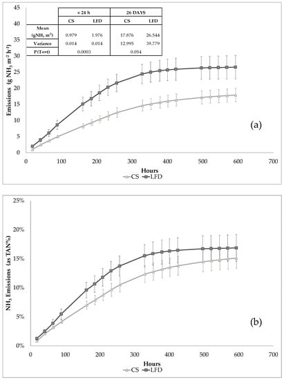 Most of the NH3 emissions occurred during the first days, specifically LFD emitted more than CS till the 15th day. Mean cumulative NH3 emissions within 24 h was significantly higher from LFD than CS (p < 0.05), but it was not significantly different over the 26th day of the measurement period (Figure 2a).