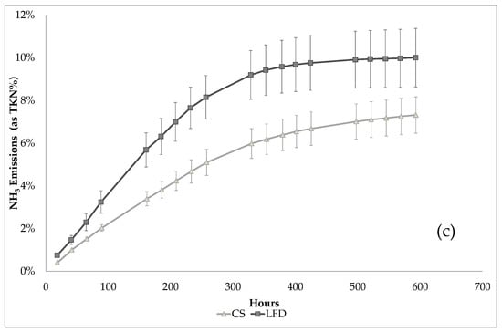 Nevertheless, for both materials, it was observed a decreasing trend of NH3 emissions. Mainly, this phenomenon was recorded during the last week of the storage. Concerning the cumulative NH3 emission, CS demonstrates to emit 33% less than LFD. In particular, the cumulative emissions accounted for 17.9 g NH3 m−2 (15% as TAN and 7% as TKN) and 26.5 g NH3 m−2 (17% as TAN and 10% as TKN) for CS and LFD, respectively.