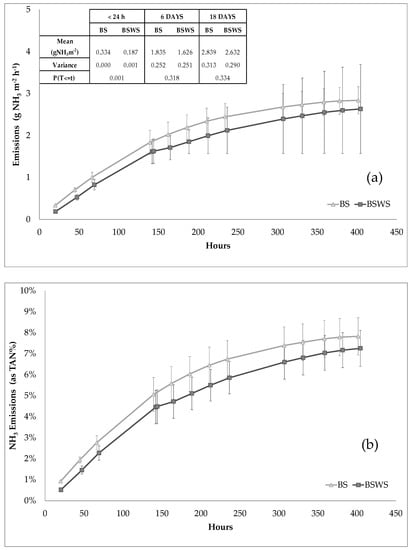 The overall reduction in terms of NH3 emissions associated with the straw application was 7.3%; specifically, the cumulative emissions accounted for 2.632 g NH3 m−2 (8% as TAN and 4% as TKN) and 2.839 g NH3 m−2 (7% as TAN and 3.7% as TKN) for BSWS and BS, respectively.